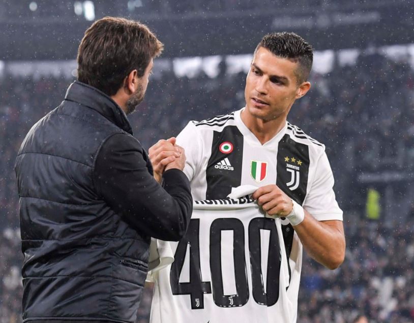 Перед матчем против "Кальяри" президент "Ювентуса" Андреа Аньелли вручил португальскому нападающему команды Криштиану Роналду памятную футболку с цифрой "400".