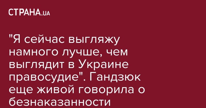 "Всем привет, друзья. Мне не разрешают много говорить, поэтому не буду. Во-первых, ходу поблагодарить вас всех, что я живая. И хочу поблагодарить всех за хорошие слова - они очень мотивируют. И хочу поблагодарить за плохие слова - они на самом деле мотивирую еще больше. Выйти из больницы поскорее. Я выгляжу сейчас плохо, но меня хорошо лечат украинские врачи. И я знаю, что я сейчас выгляжу намного лучше, чем выглядит в Украине правосудие и справедливость. Потому их сегодня не лечит никто", - говорила Гандзюк.