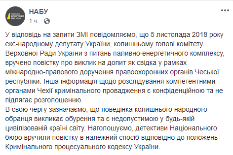 "Подчеркиваем, детективы Национального бюро вручили повестку надлежащим образом в соответствии с положениями Уголовного процессуального кодекса Украины", - сказано в сообщении Нацбюро.