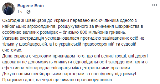"Сегодня из Швейцарии в Украину передан экс-глава одного из крупнейших агрохолдингов, разыскиваемый за совершение мошенничества в особо крупных размерах - около 800 миллионов гривен", - написал он на странице в Facebook.