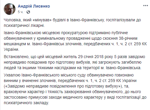 Как сообщил Лысенко в понедельник на своей странице в соцсети Facebook, Ивано-Франковская местная прокуратура поддержала публичное обвинение в уголовном производстве о совершении жителем г.Ивано-Франковск преступлений, предусмотренных ч.1, ч.2 ст.259 Уголовного кодекса Украины (заведомо ложное сообщение о подготовке взрыва).