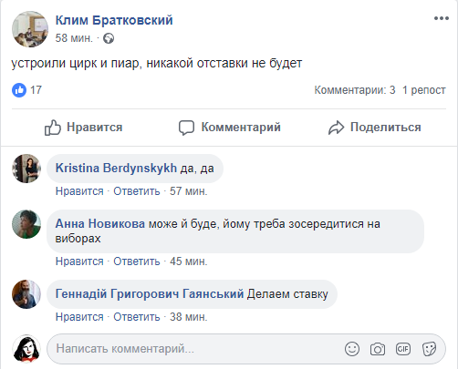 Блогер и юрист Клим Братковский написал: "Устроили цирк и пиар, никакой отставки не будет".