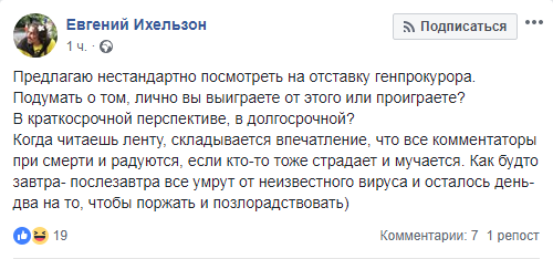 "Когда читаешь ленту, складывается впечатление, что все комментаторы при смерти и радуются, если кто-то тоже страдает и мучается. Как будто завтра - послезавтра все умрут от неизвестного вируса и осталось день - два на то, чтобы поржать и позлорадствовать", - отметил блогер Евгений Ихельзон.