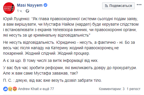 Его брат Маси Найем в своем Facebook также прокомментировал заявление генпрокурора. По его словам, Луценко ошибся, отмечая, что правоохранительные органы несут ответственность за ход следствия. "Юридически - несут, а фактически - нет.... А есть за что. В том числе за утечку информации от них", - подчеркнул Найем.