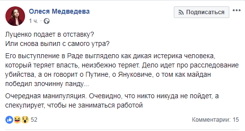 "Его выступление в Раде выглядело как дикая истерика человека, который теряет власть, неизбежно теряет. Дело идет про расследование убийства, а он говорит о Путине, о Януковиче, о том как майдан победил злочинну панду... Очередная манипуляция. Очевидно, что никто никуда не пойдет, а спекулирует, чтобы не заниматься работой", - написала Олеся Медведева на своей странице в Facebook.