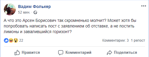 Также украинцев удивляет молчание министра МВД Арсена Авакова по поводу отставки гепрокурора, который никак не прокомментировал это событие, даже - на своей странице в Facebook.