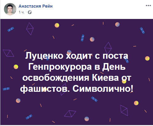 А блогер Анастасия Рейн отметила, что день, когда генпрокурор сообщил об отставке, совпадает с Днем освобождения Киева от фашистских захватчиков.