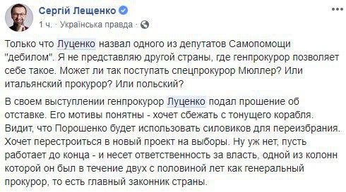 Депутат и журналист Сергей Лещенко отмечает, что, по его мнению, Луценко должен работать до конца и нести ответственность за власть, а нынешнее заявление - это попытка сбежать с тонущего корабля.