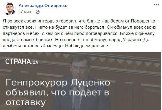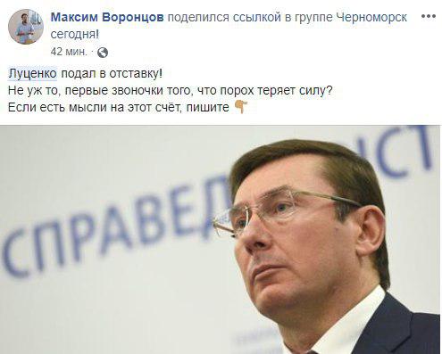 Некоторые пользователи соцсетей полагают, что отставка Луценко свидетельствуют о том, что президент Украины Порошенко теряет свои позиции.