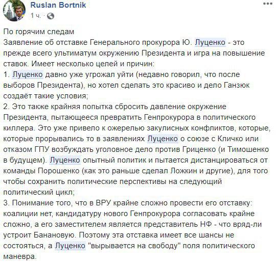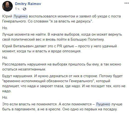 Многие пишут о том, что для Луценко данное заявление - способ вернуть политический вес и пиар-ход, лучшего времени для которого не найти. Некоторые - предсказывают, как будет разворачиваться этот "политический маневр".