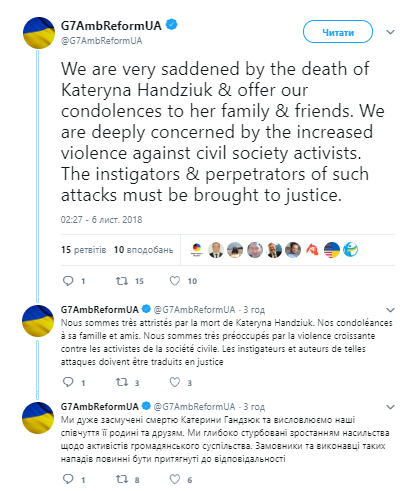 G7 призывала Украину найти заказчиков и исполнителей убийства Екатерины Гандзюк