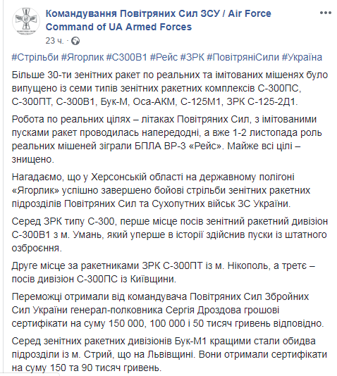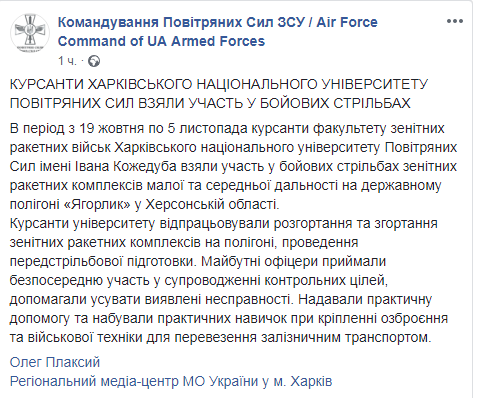 Об этом сообщает командование Воздушных сил ВСУ на своей странице в Facebook.