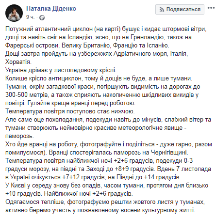 Диденко отмечает, что температура воздуха ближайшей ночью составит +2...+6 градусов, местами 0...-3 градуса. Днем 7 ноября в Украине ожидается +7...+12 градусов, на юге до +14 градусов. В Киеве в среду без осадков, временами туманы, в течение дня около +10 градусов. Ближайшей ночью +2...+6 градусов.