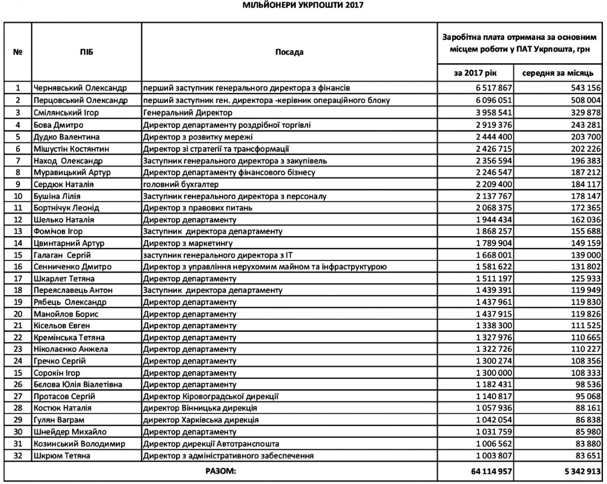 Вторую по величине зарплату получает заместитель гендиректора "Укрпочты" Александр Перцовский. Его заработок составляет 6 млн грн в год. При этом в 2016 году у него было всего 3,6 млн ривен. Что касается главы компании Игоря Смелянского, он оказался на третьем месте рейтинга зарплат. Его заработок составил почти 4 млн грн в год.