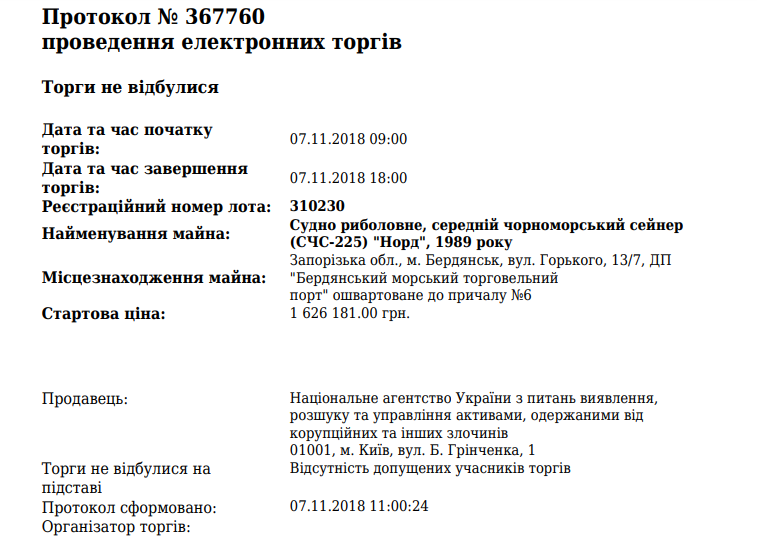 Аукцион был назначен на 7 ноября. Судно оценивалось в 1 626 181 грн. Шаг аукциона должен был составить 16 261 грн. Всего было зарегистрировано 12 заявок от участников аукциона, однако все они были отклонены, поэтому торги не состоялись. Причина такого решения не разглашается.