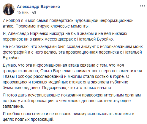 "Я, Александр Варченко никогда не был знаком и не вёл никаких переписок ни в каких мессенджерах с Натальей Бурейко. Не исключаю, что хакерами был создан аккаунт с использованием моих фотографий и с него велась эта провокационная переписка с Натальей Бурейко. Думаю, что эта информационная атака связана с тем, что моя гражданская жена, Ольга Варченко занимает пост первого заместителя Главы Госбюро расследований и многим стала костью в горле. О провокациях и грязных медийных атаках она заявляла публично буквально недавно. Подозреваю, что это только начало", - написал он.