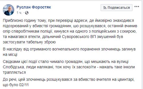 По его данным, утром, 8 ноября, во время проверки адреса, где предположительно находился подозреваемый в убийстве, мужчина оказал сопротивление сотрудникам полиции и бросился на одного из полицейских с топором. Подозреваемый пытался сбежать, сотрудник полиции открыл огонь, застрелив мужчину на месте. Форостяк отмечает, что застреленный мужчина подозревался в убийстве преподавателя одного из ВУЗов Одессы на местном кладбище.