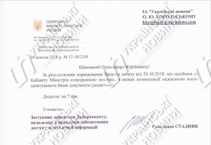Об этом говорится в ответе Кабмина на запрос "Украинских Новостей".