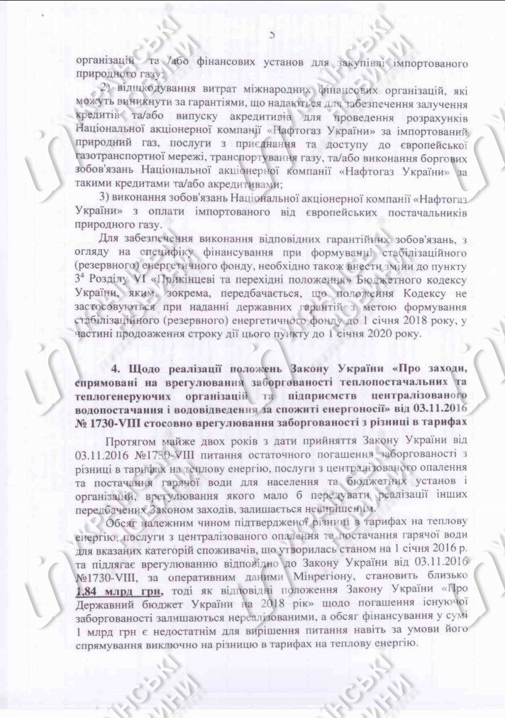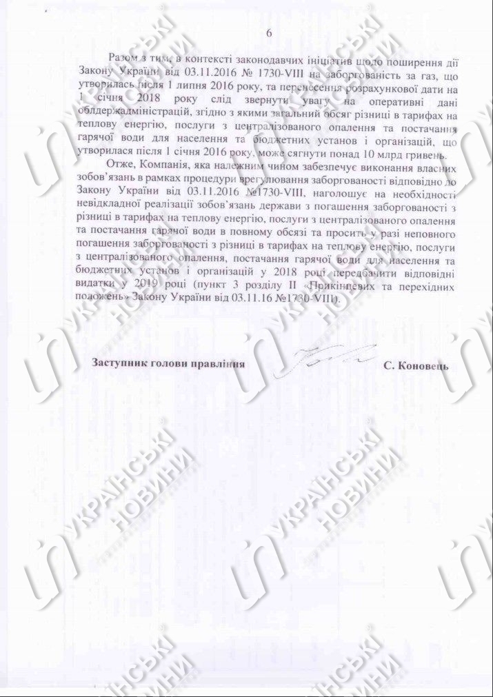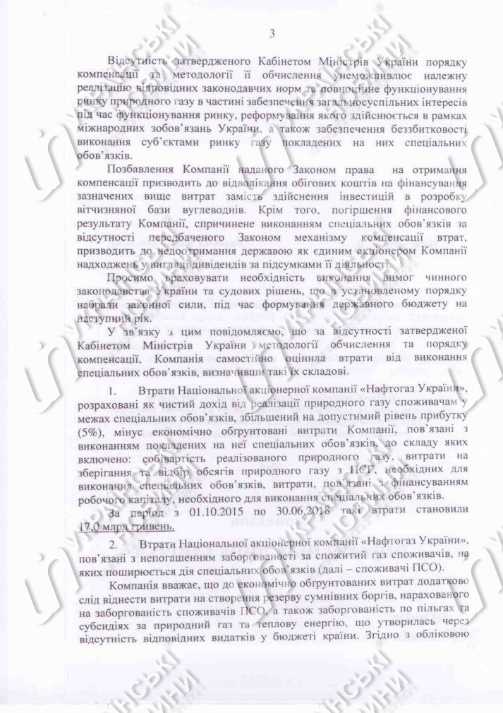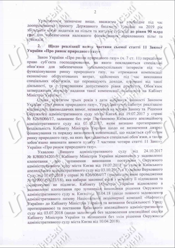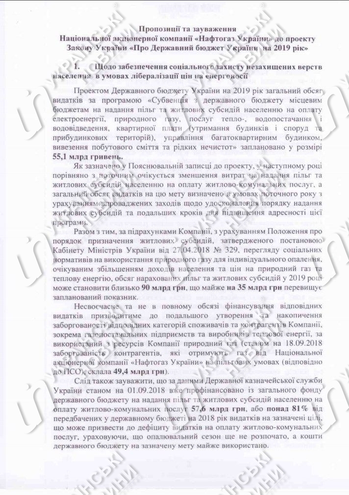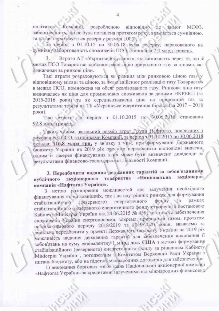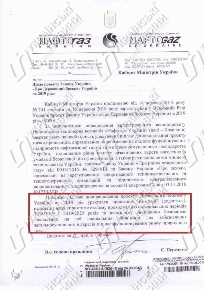 "Просим при доработке проекта Государственного бюджета на 2019 учесть предложения компании (прилагается), реализация которых будет способствовать устойчивому прохождению отопительных периодов 2018/2019 и 2019/2020 и надлежащему выполнению компанией возложенных на нее специальных обязанностей для обеспечения общественных интересов во время функционирования рынка природного газа", - говорится в письме.