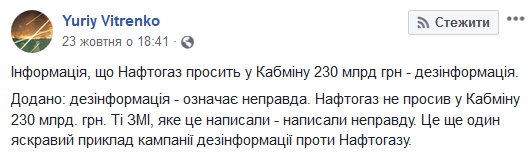 "Информация, что "Нафтогаз" просит у Кабмина 230 млрд гривен - дезинформация. Дополнено: дезинформация - значит неправда. "Нафтогаз" не просил у Кабмина 230 млрд гривен. Те СМИ, которое это написали - написали неправду. Это еще один яркий пример кампании дезинформации против "Нафтогаза", - написал Витренко на своей странице в социальной сети Facebook.