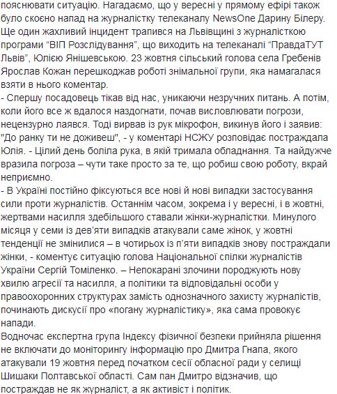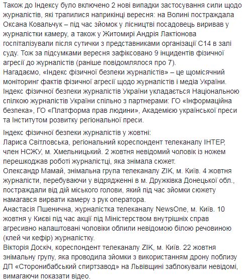Он отмечает, что по данным мониторинга "Индекс физической безопасности журналистов Украины", с начала года в Украине произошел 71 случай проявления физической агрессии в отношении сотрудников СМИ. "В октябре силу к работникам СМИ применяли в Киеве - сразу 3 инцидента, также произошло по одному случаю в области и в Хмельницком. Как и в сентябре, жертвами насилия в основном были женщины-журналистки, которые в октябре пострадали в четырех из пяти случаев", - отмечает Томиленко.