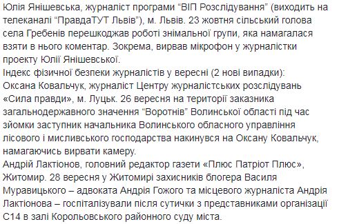 - Юлия Янишевская, журналист программы "ВИП Расследование" (выходит на телеканале "ПравдаТУТ Львов"), г. Львов. 23 октября сельский голова села Гребенов препятствовал работе съемочной группы, которая пыталась взять у него комментарий. В частности, вырвал микрофон у журналистки проекта Юлии Янишевской.