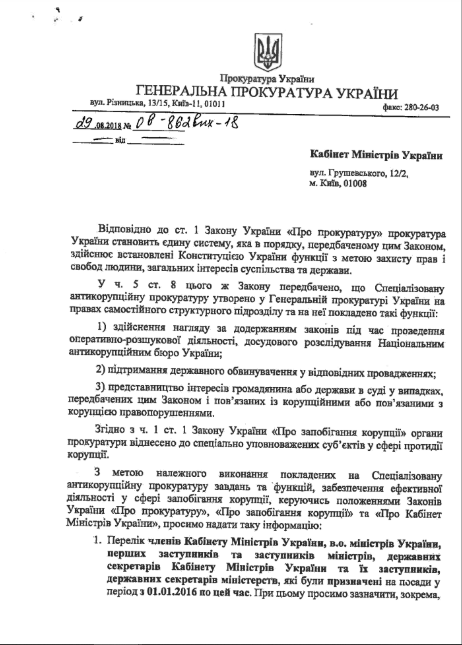 В августе 2018 года Специализированная антикоррупционная прокуратура (САП) заинтересовалась подробной информацией о всех членах Кабинета министров Владимира Гройсмана. Об этом говорится в письме заместителя руководителя Специализированной антикоррупционной прокуратуры (САП) Владимира Кривенко, которое распространил глава экспертной организации StateWatch Глеб Каневский, пишет "Экономическая правда".