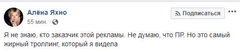 А киевлянка Алена Яхно пишет, что не знает, кто заказчик этой рекламы, но вряд ли ПР. "Но это самый жирный троллинг, который я видела", - отмечает она.