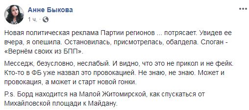 В самом центре Киева появились рекламные борды с троллингом БПП. Об этом пишут пользователи в Facebook. Киевляне сообщают, что на Малой Житомирской размещена реклама якобы от Партии регионов со слоганом: "Вернем своих из БПП!"