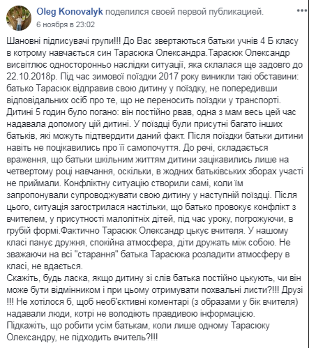"Отец провоцирует конфликт с учителем в присутствии малолетних детей, во время урока, угрожает в грубой форме. Фактически Александр Тарасюк травит учителя. В нашем классе дружная, спокойная атмосфера, дети дружат между собой. Несмотря на все старания отца Тарасюка, разладить атмосферу в классе не удастся", - написал Коновалик.