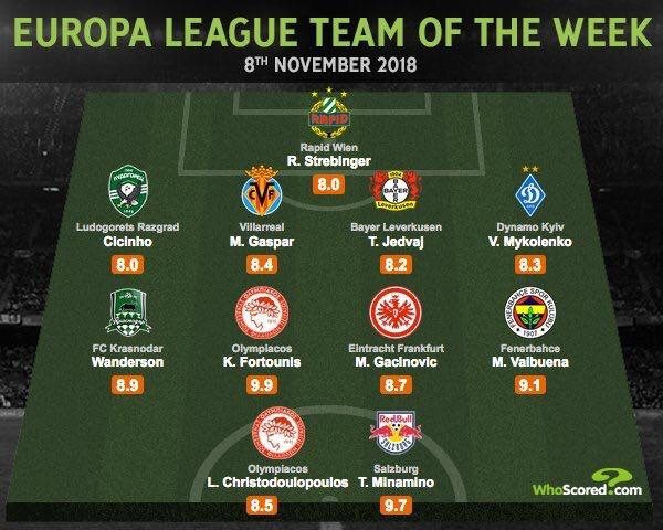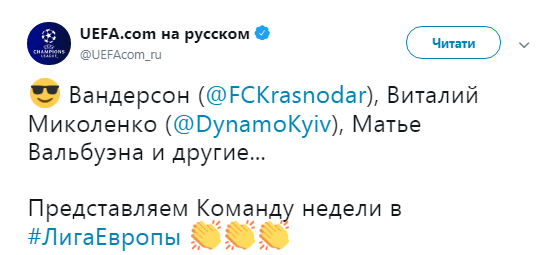 Левый защитник киевского Динамо Виталий Миколенко вошел в символическую сборную лучших футболистов тура в Лиге Европы по версии УЕФА. Также он оказался в "команде недели" авторитетного сайта WhoScored.