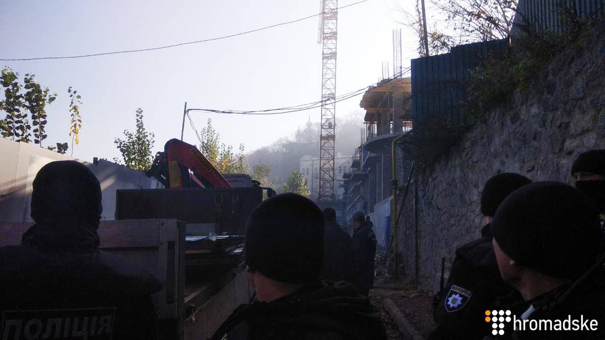 Сегодня, 9 ноября, на Андреевском спуске сносят часть забора, который ограждает участок, где ведутся работы. После этого должен быть решен вопрос о демонтаже строительного крана. На месте собрались активисты, которые выступают против строительства, по их словам, взрывы являются провокацией.