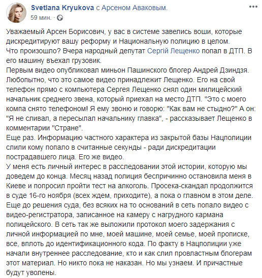 У меня есть личный интерес в расследовании этой истории, которую мы доведем до конца. Месяц назад полиция беспричинно остановила меня в Киеве и попросил пройти тест на алкоголь. Просека-скандал продолжится в суде 16-го ноября (всех ждем, приходите), а пока о главном в этом деле. Еще до решения суда, без всяких на то оснований в сеть попало видео с видео-регистратора, записанное на камеру с нагрудного кармана полицейского. В сеть так же выложили протокол моего задержания с личной информацией по мне, моей машине, моей семье, моей прописке, все, вплоть до идентификационного кода. По факту в Нацполиции уже начали внутреннее расследование, кто и как слил провластным блогерам этот материал. Но никто пока не наказан. Но мы узнаем. И причастные будут уволены", - написала она.