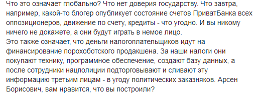 По словам Светланы Крюковой, подобные инциденты свидетельствуют, о глобальном отсутствии доверия к государству. А если возможны подобные прецеденты, то в будущем, возможно, например, что какой-то блогер опубликует состояние счетов ПриватБанка всех оппозиционеров, движение по счету, кредиты - что угодно.