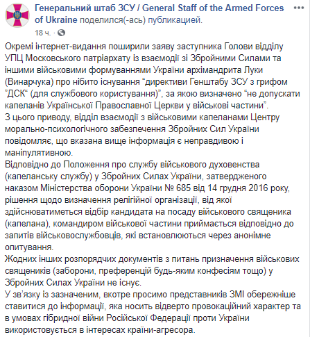 Ранее заместитель председателя отдела Украинской православной церкви (МП) архимандрит Лука (Винарчук) заявил, что Генштаб распорядился не допускать капелланов УПЦ МП во все воинские части страны еще весной 2018 года.