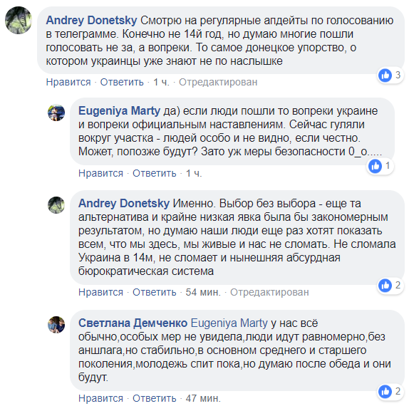 11:55  Сторонники "ДНР" (среди которых есть и противники Пушилина) обсуждают в соцсетях, что люди, несмотря на всеобщую апатию и усталость от ситуации, идут на участки.