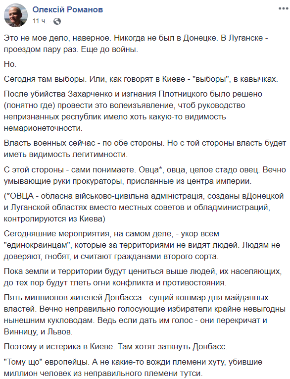 20:00  Одесский журналист Юрий Ткачев пишет у себя в Telegram, что дончане и луганчане пошли на выборы, чтобы ответить на запугивания и угрозы из Киева - а не для того, чтобы утвердить Пушилина или Пасечника на своих постах.