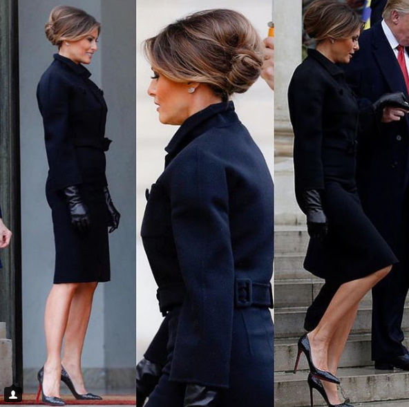 Так, Мелания надела утонченное осеннее пальто от Bottega Veneta с ремешком на поясе и широкими рукавами. К нему Мелания подобрала кожаные перчатки. Отметим, что во время визита во Францию Мелания отказалась от традиционной укладки волос. Зато она продемонстрировала элегантную прическу.