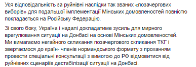 Также украинская сторона Трехсторонней контактной группы отмечает, что "результаты этих псевдовыборов являются юридически ничтожными, не создают никаких правовых последствий и следовательно не признаются Украиной и цивилизованным миром".