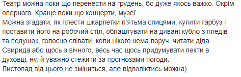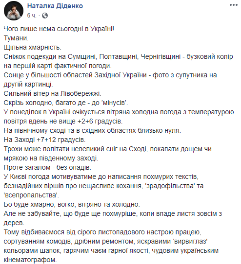 Синоптик также отметила, что погода в Киеве будет мотивировать к написанию мрачных текстов, безнадежных стихов о несчастной любви, "зрадофильства" и "всепропальства". Потому что будет облачно, сыро, ветрено и холодно.