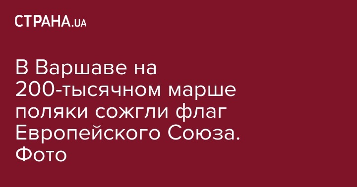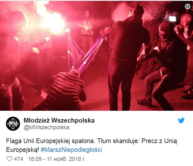 Участники шествия в Варшаве в честь 100-летия независимости Польши сожгли флаг ЕС. Об этом в Twitter сообщила организация "Всепольская молодёжь".