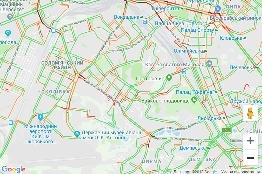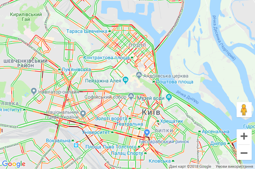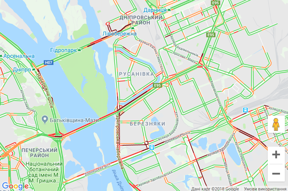 Из-за ДТП пробки образовались возле станций метро "Житомирская", "Ипподром", "Дружбы народов", "Осокорки" и "Бориспольская". Затруднено движение и на Левом берегу Киева.