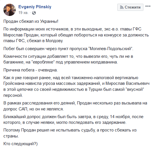 "Продан сбежал из Украины! По информации моих источников, в эти выходные, экс-и.о. главы ГФС Мирослав Продан, который обещал побороться на конкурсе за должность главы ГФС, сбежал в Молдову.