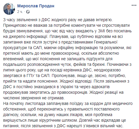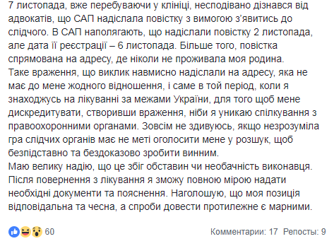 "7 ноября, уже находясь в клинике, неожиданно узнал от адвокатов, что САП прислала повестку с требованием явиться к следователю. В САП настаивают, что прислали повестку 2 ноября, но дата ее регистрации – 6 ноября. Более того, повестка направлена на адрес, где никогда не проживала моя семья. Такое впечатление, что вызов намеренно прислали на адрес, который не имеет ко мне никакого отношения, и именно в тот период, когда я нахожусь на лечении за пределами Украины, для того чтобы меня дискредитировать, создав впечатление, будто я избегаю общения с правоохранительными органами", - написал Мирослав Продан.