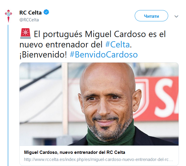 В испанской Ла Лиге еще один клуб заменил главного тренера. Новым наставником Сельты стал португалец Мигель Кардосо. Бывший ассистент Паулу Фонсеки в донецком Шахтере сменил на тренерском мостике аргентинца Антонио Мохамеда. Об этом сообщает официальный Twitter команды.