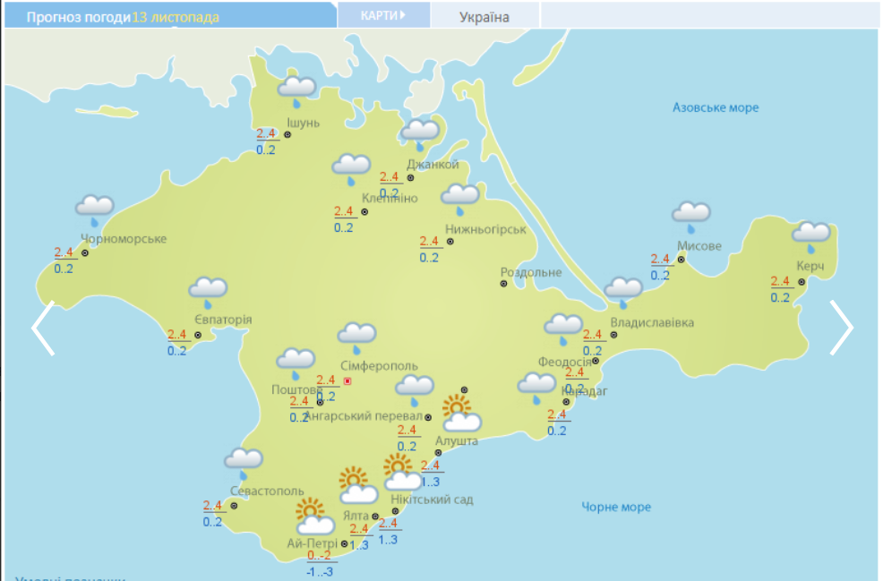 По информации Украинского гидрометцентра, во вторник, 13 ноября, на севере, западе и востоке Крыма возможны небольшие дожди при плюсовой температуре от 2 до 4 градусов, а на юге полуострова будет без осадков, но местами столбик термометра покажет 2 градуса мороза, передает 112-Украина.