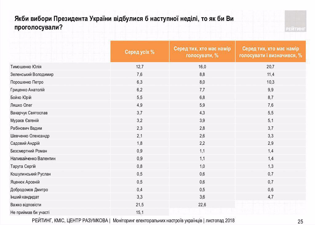 У его ближайших конкурентов Владимира Зеленского и Юлии Тимошенко, которая возглавляет рейтинг - 7,6% и 12,7% соответственно.