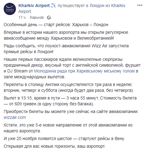 Во вторник, 13 ноября, стартовали рейсы Харьков - Лондон лоукост-авиакомпании Wizz Air. Об этом сообщает пресс-служба аэропорта "Харьков" на своей странице в Facebook.
