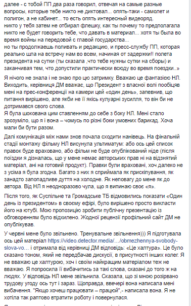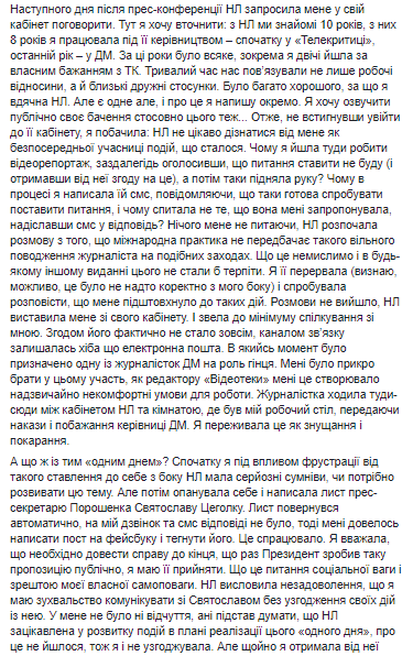 "Пару слов о том, как ДМ подал новость с пресс-конференции. Мероприятие началось в 15:00, длилось 2 часа, свой вопрос я задала около 16:00. Новость на УП под заголовком "Не сахар - Порошенко пригласил журналистку посмотреть, как живет" появилась в 16:16. Я не имела отношения к производству именно новостей на "Телекритике" или ДМ, но годами видела, как только какой-то журналист становился ньюсмейкером, наша редакция пыталась первой взять у него комментарий. На этот раз, когда я, журналистка ДМ, стала ньюсмейкером, и об этом написали все, мое издание не спешило и в моих комментариях не нуждалось. Наконец в 18:10 было найдено решение: новость дали на подсайте MediaLife. Не помню точно, была ли вообще эта новость в ленте на главной странице ДМ", - вспоминает журналистка.
