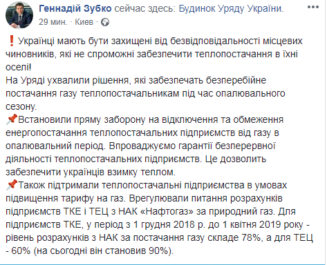 14 ноября Кабинет министров Украины принял решение о введении прямого запрета на отключение от газа и энергоснабжения теплоснабжающих предприятий в отопительный период. Об этом написал вице-премьер-министр - министр регионального развития, строительства и ЖКХ Украины Геннадий Зубко на своей странице в Facebook.